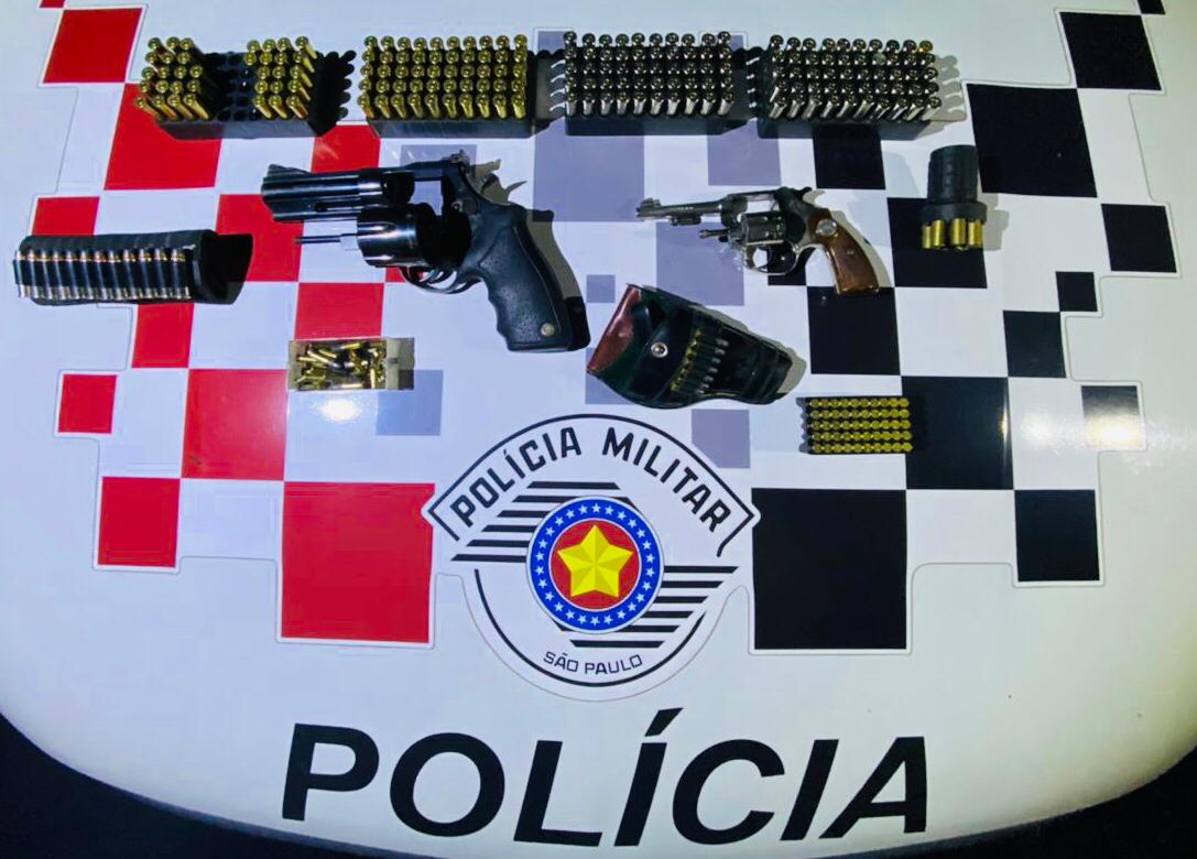 No forro do galpão e dentro de um pote, foram localizados um revólver calibre 38, um outro revólver calibre 22, além de 188 munições calibre 38, mais 90 de calibre .22, além de 18 cartuchos calibre 3.57 e 3 balas .380.