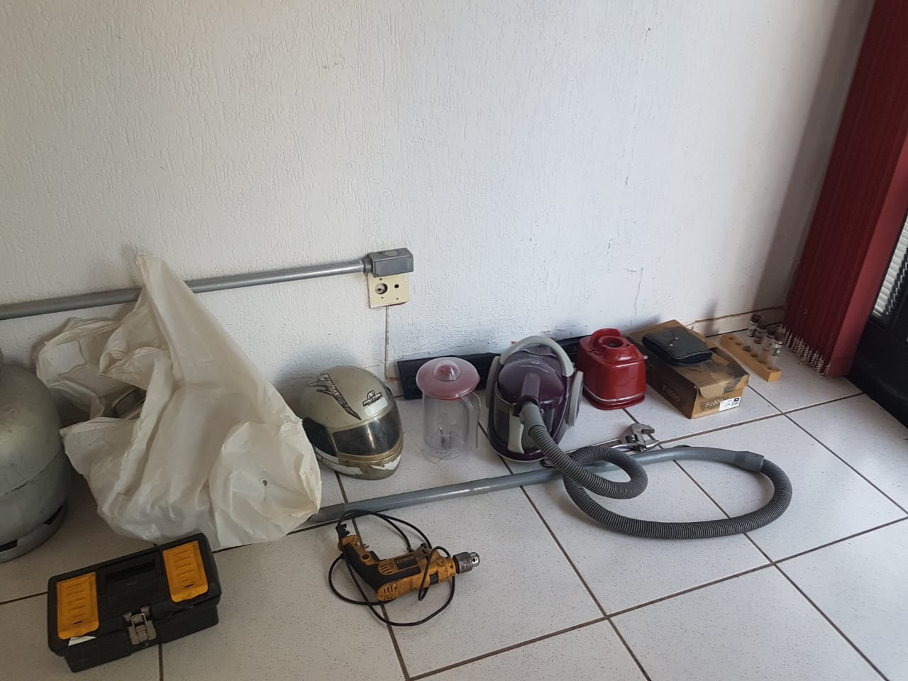 Também levaram um aspirador, um liquidificador, uma caixa de ferramentas, um capacete, uma furadeira, dentre outros produtos. Eles colocaram tudo dentro de um Fiat Uno da família e fugiram. Uma Honda Titan 150 vermelha também foi levada por um dos marginais.