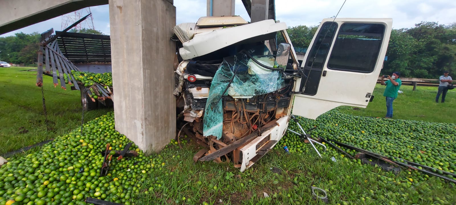 Com o impacto, a cabine do caminhão ficou quase por completo destruída, o condutor escapou ileso. A carga de limão ficou espalhada pelo gramado.