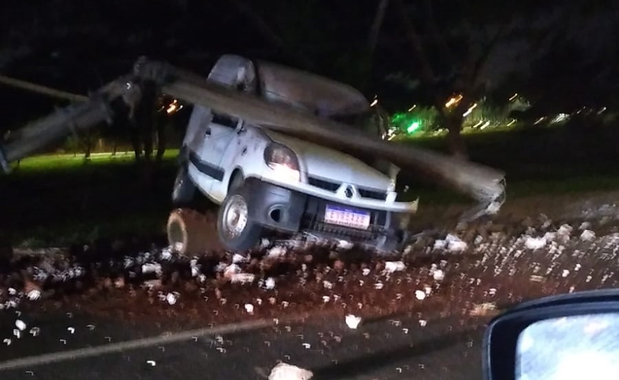 Com o forte impacto, o poste e a fiação acabou caindo sobre o veículo, provocando uma cena impactante.