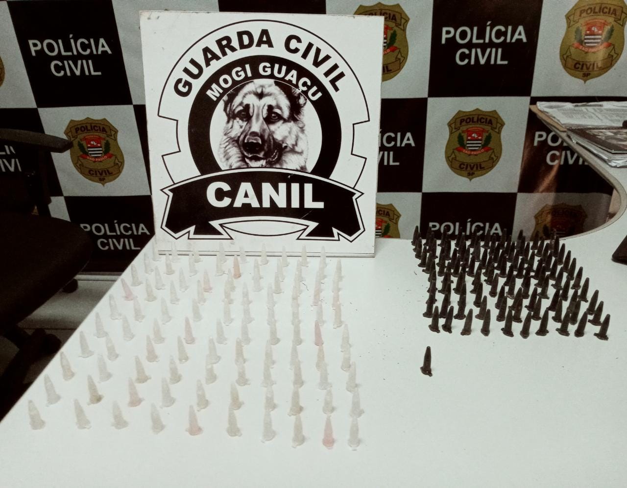 A sacola foi encontrada pela Cadela Babi e dentro havia 200 pinos de cocaína, material apresentado na Central de Polícia Judiciária e apreendida.