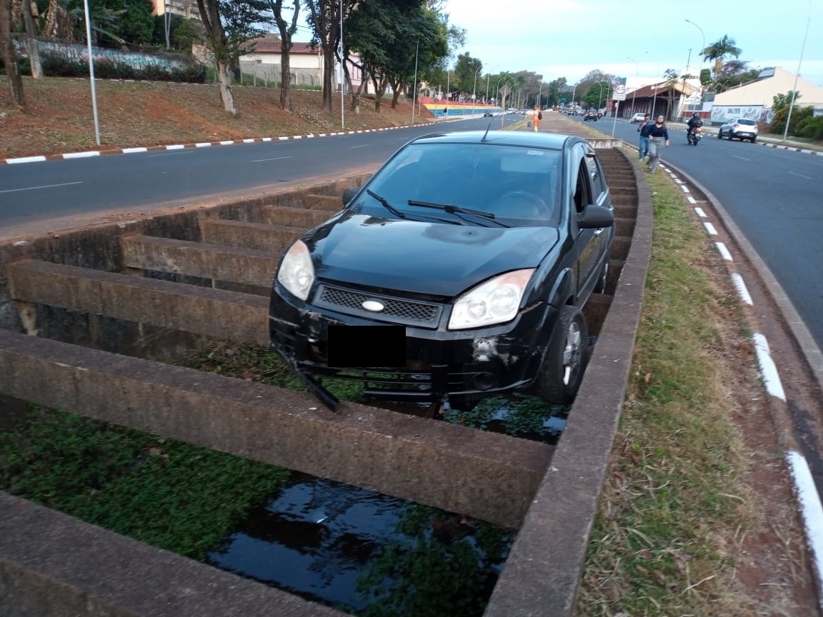 No final da tarde desta quinta (05), a condutora de um Ford Fiesta, que trafegava pela Avenida dos Trabalhadores, sentido centro-bairro foi parar em cima dos pergolados de concreto que estão sobre o Córrego Cantagalo próximo a antiga estação férrea.