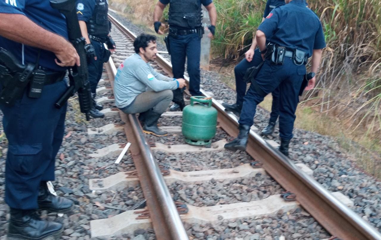Os GCMs Codogno, Souza e Silva estavam em patrulhamento pela zona sul da cidade no final da tarde desta quinta (20), quando pela Rua Benedito Euclides Martins no Jardim Bandeirantes avistaram um homem sobre a linha férrea com um maçarico, cilindro e botijão de gás.