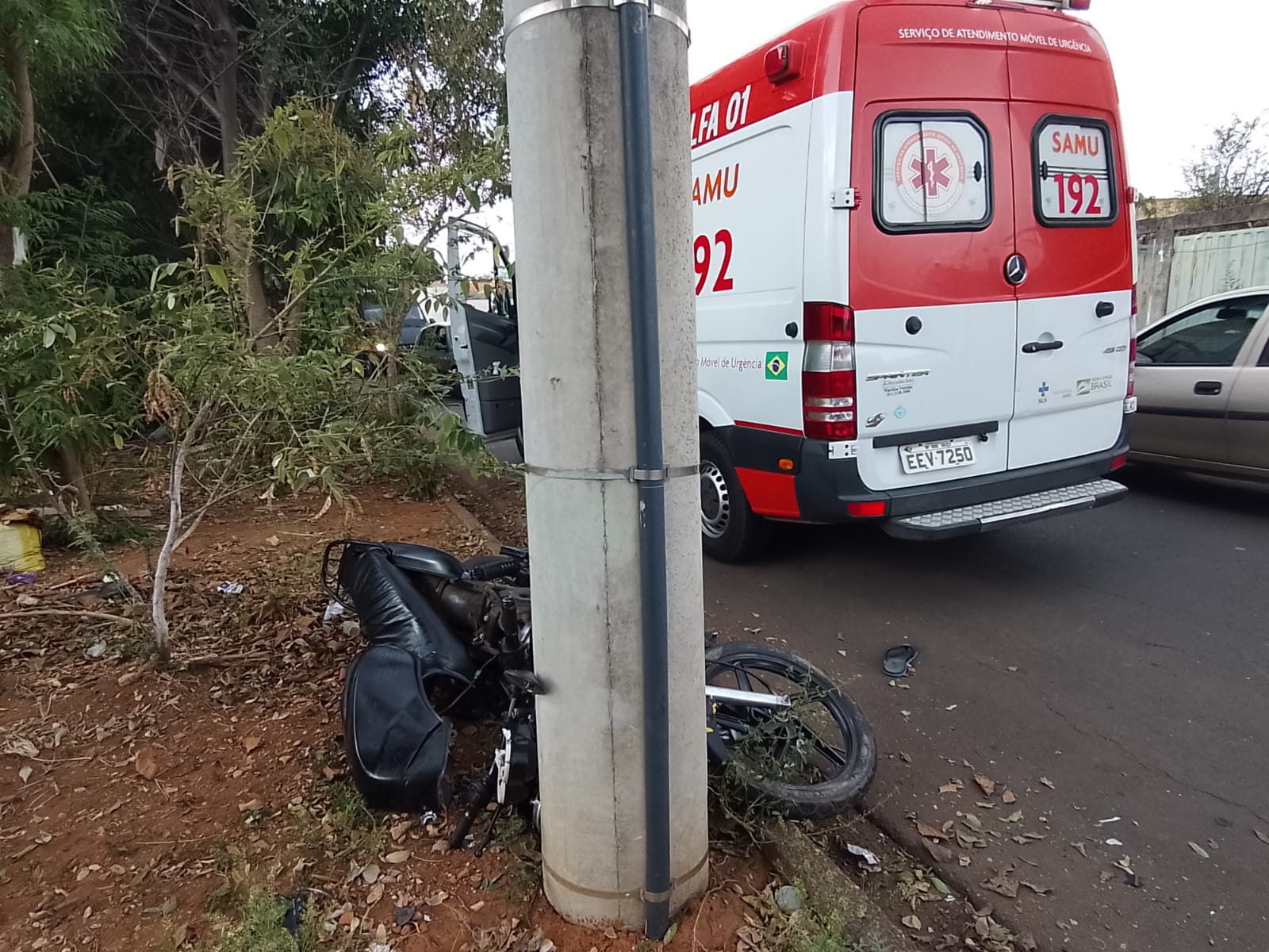 Segundo apurado, a condutora de uma motocicleta, com aproximadamente 30 anos de idade colidiu violentamente contra um poste de iluminação da ELEKTRO.