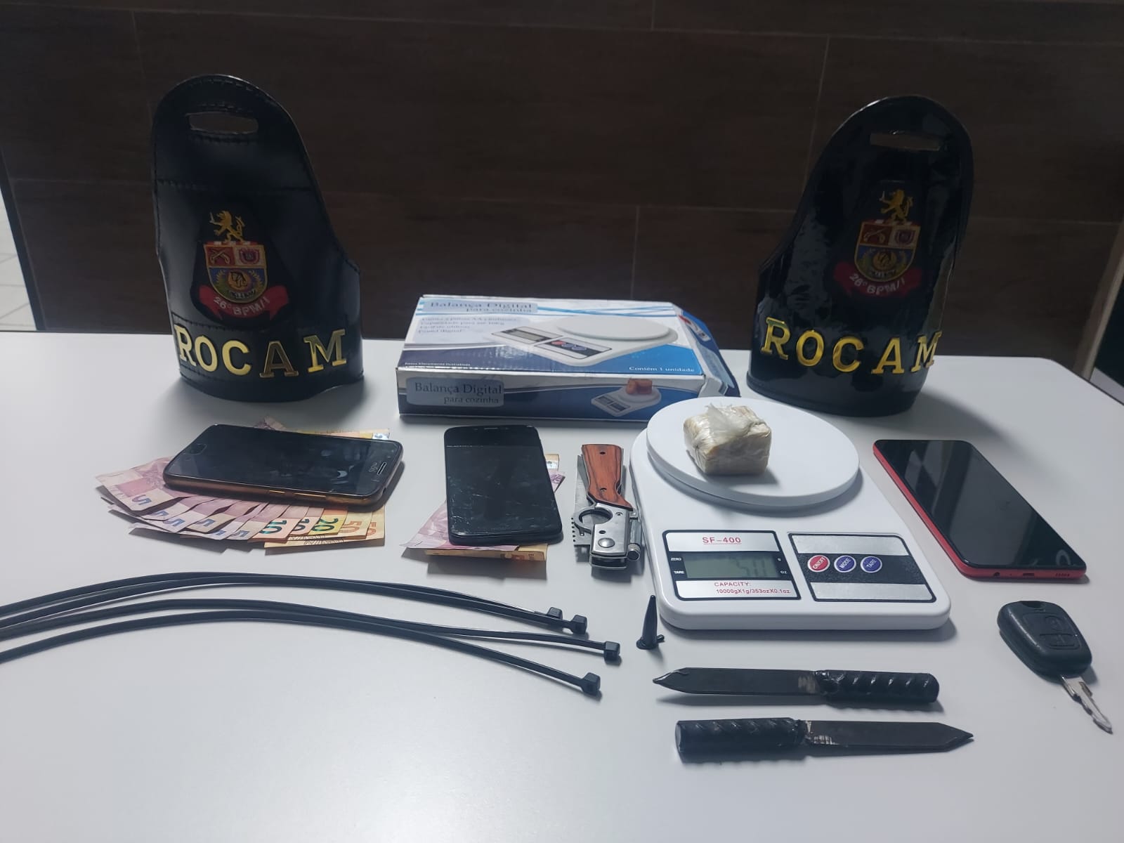 Também no interior do carro, os PMs encontraram uma balança de precisão, um tubete com cocaína, R$ 55,00 duas facas e um canivete. Uma viatura de Força Tática, sob o comando do Sargento Assis e com os Cabos Goulart e Montefusco, levaram os três à Central de Polícia Judiciária.