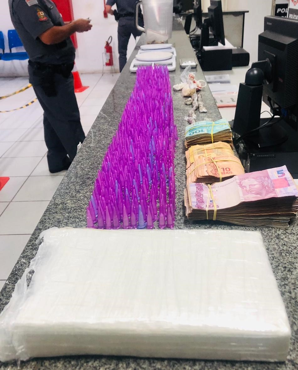 Ambos foram conduzidos até a presença do delegado, que ouviu as partes e as liberou. Foram apreendidos 1 tijolo de cocaína pura, pesando 1,3 quilo, 657 pinos de cocaína, 8 invólucros contendo maconha e duas pedras de crack.