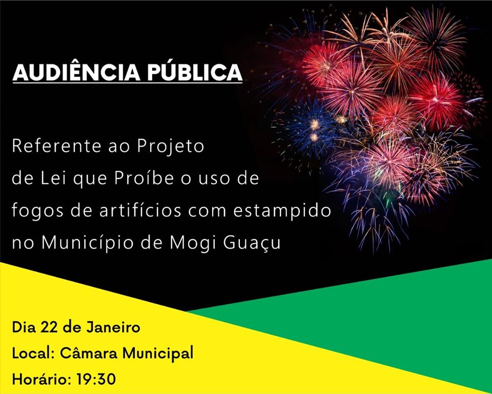 A Câmara Municipal de Mogi Guaçu promoverá no dia 22 de Janeiro (quarta-feira), uma audiência pública, a partir das 19h30, com o intuito de debater junto aos segmentos organizados da sociedade, aos Poderes Públicos constituídos e com a sociedade em geral sobre a proibição ou não da soltura de fogos de artificio e similares com estrondo ou estampido em Mogi Guaçu. A audiência acontece no plenário do Legislativo.