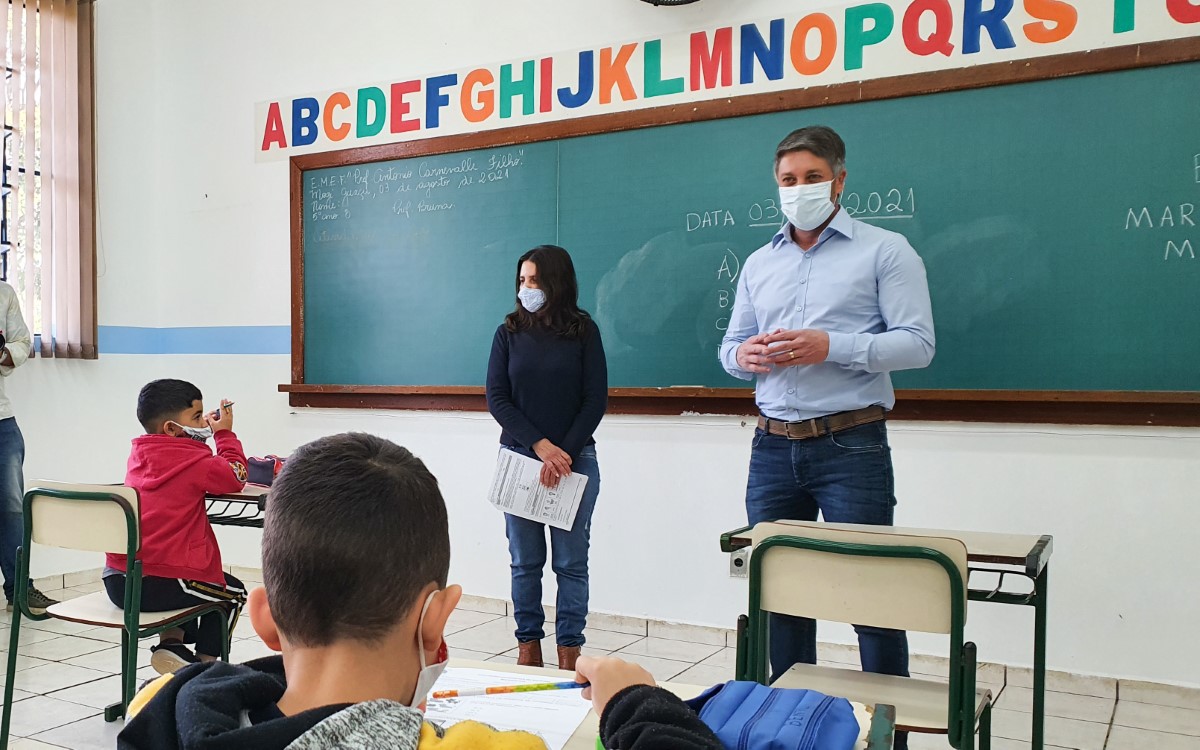 Na tarde desta terça-feira, dia 3 de agosto, o prefeito Rodrigo Falsetti esteve na Escola Municipal Professor Antônio Carnevalle Filho, no Jardim Novo Itacolomy, na Zona Sul, para acompanhar ao lado dos alunos o retorno presencial às aulas, dialogar com a equipe e vistoriar as dependências da instituição de ensino ao lado da secretária municipal de Educação, Ana Flávia Camargo Barbosa Chiorato.