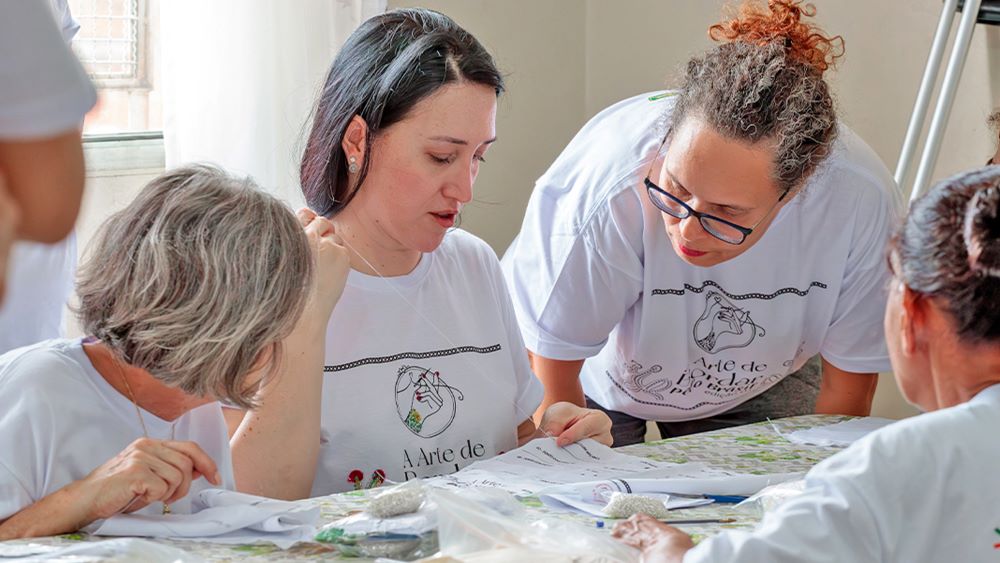 As integrantes vão receber um kit de bordado, composto por tecido, agulha, fio e pedrarias, para que possam utilizar tanto durante a realização das atividades, quanto para iniciar a criação das suas primeiras peças após a qualificação. Além disso, recebem cartilha com o passo a passo da arte de bordar, para consulta durante e posteriormente às aulas. Entre as temáticas desenvolvidas nas formações, estão o aprendizado de dezesseis pontos de bordado em pedraria e formas de arremate.