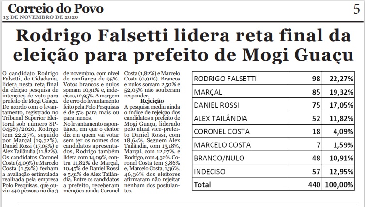 O Jornal Correio do Povo, distribuído há mais de 11 anos em Mogi Guaçu publicou na edição desta sexta-feira, dia 13, pesquisa eleitoral registrada no TSE (Tribunal Superior) sobre a intenção de votos para Prefeito nas eleições que acontece no próximo domingo, dia 15.