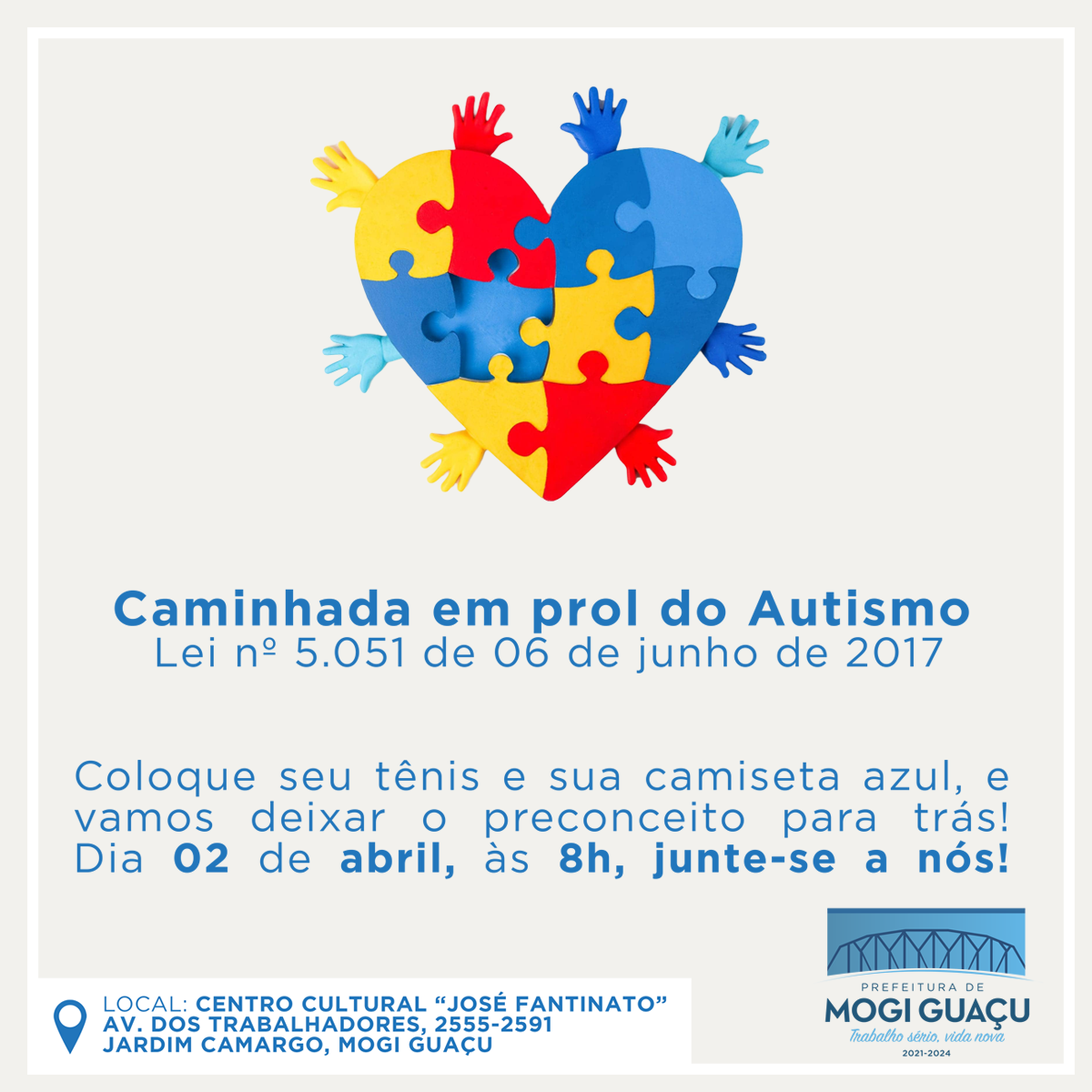 A 1ª Caminha pela Conscientização do Autismo de Mogi Guaçu será realizada no próximo domingo, 2 de abril, data em que celebra o Dia Mundial da Conscientização do Autismo, instituída pela Organização das Nações Unidas (ONU). O evento será a partir da 8h no Centro Cultural, localizado na Avenida dos Trabalhadores, nº 2.651, no Jardim Camargo.