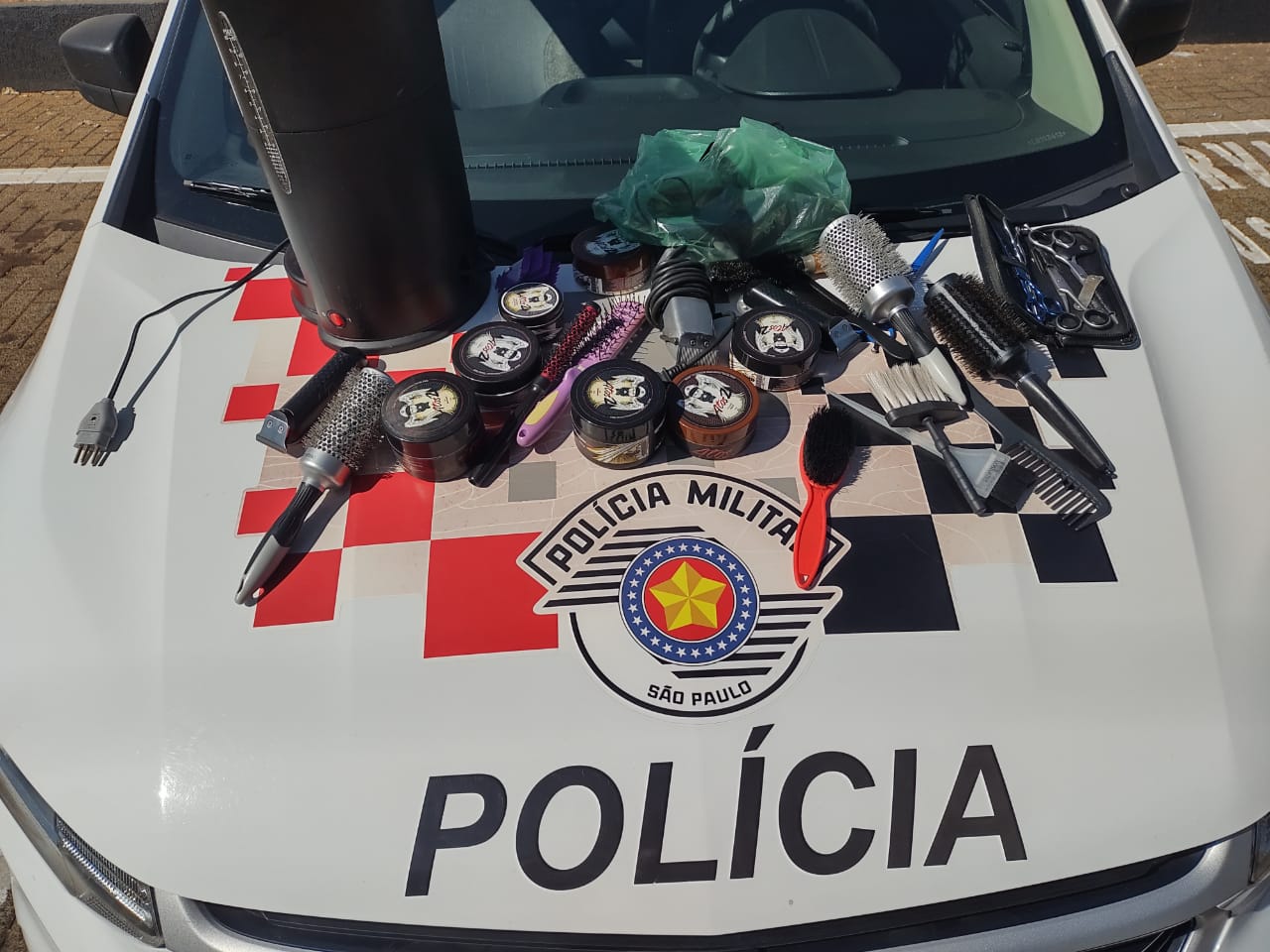A PM informou que havia recuperado vários objetos e a segunda vítima também identificou que se tratavam de seus materiais de trabalho, secador de cabelo, escovas, máquinas de cortar cabelo e outros.