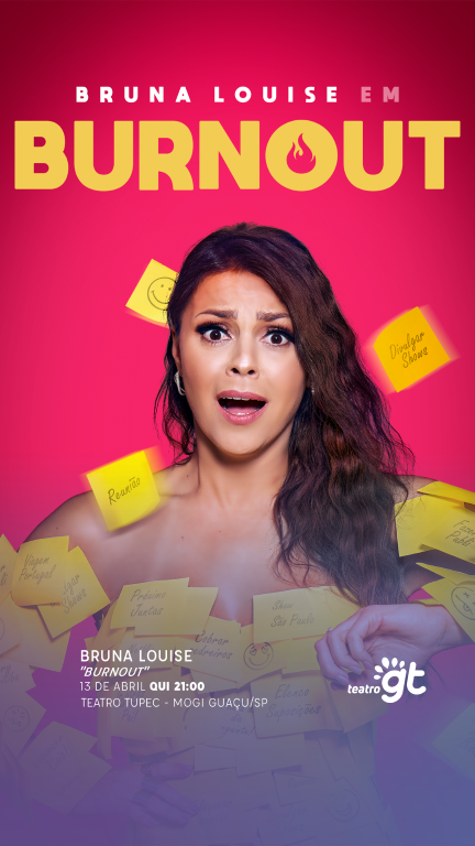 A humorista Bruna Louise apresenta o show “Burnout”, às 21 horas, no Teatro Tupec em Mogi Guaçu. Os ingressos custam de R$40,00 a R$80,00 e podem ser adquiridos na bilheteria do Teatro (Av. dos Trabalhadores, 2555-2591 – Jardim Camargo II, Mogi Guaçu – SP) ou pelo site www.megabilheteria.com. O espetáculo tem classificação etária de 16 anos. Mais informações pelo site www.teatrogt.com.