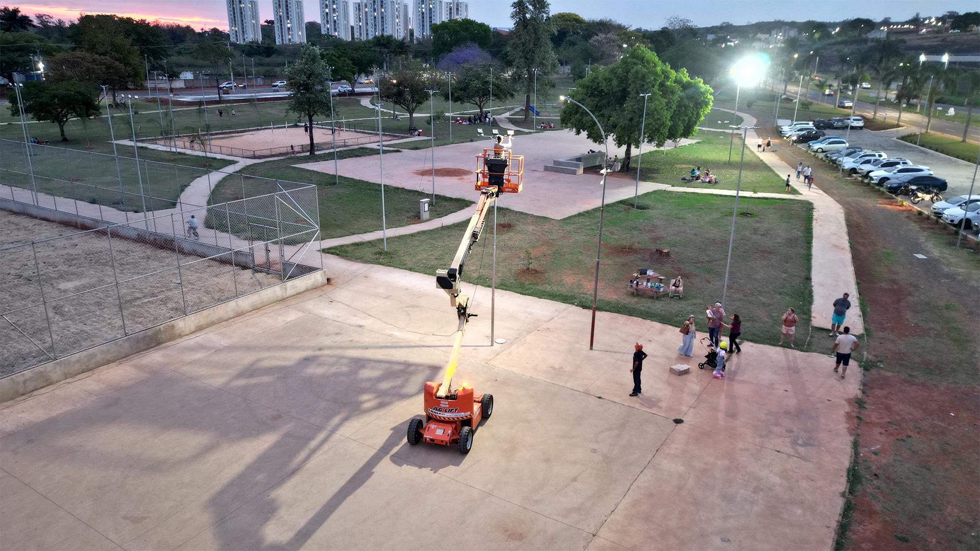 No último sábado, 4 de outubro, a empresa responsável pelo projeto de renovação da Praça Francisco Marchese, o Campo do TG, no Jardim Nossa Senhora das Graças, o BNH, realizou uma ação-teste para verificar a eficiência dos refletores da nova iluminação da pista de patinação e do campo de futebol society. Além disso, também já foi iniciada a implantação do novo paisagismo do espaço e é realizado ainda a construção do muro de ala da ponte sobre o córrego que fica no local.