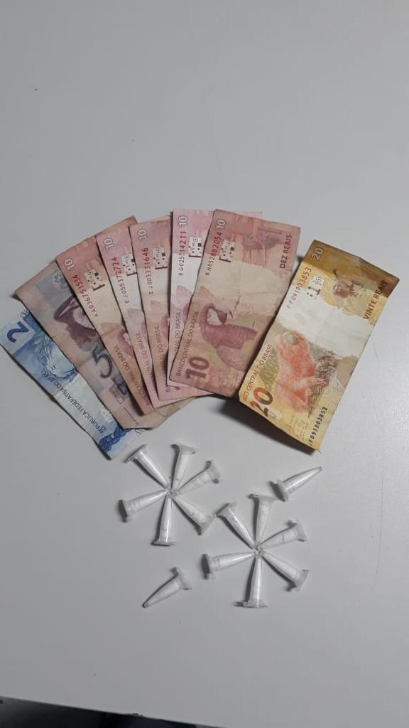Diante das características dos suspeitos, a equipe abordou o casal pelo local onde com Rodrigo foi localizado R$77,00 em dinheiro e com Viviane localizado em um tubete 14 pinos de cocaína.