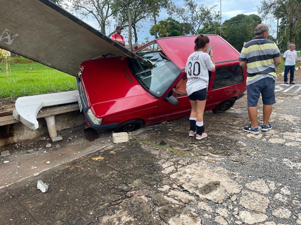 Um motorista colidiu seu carro, um Fiat Uno, contra a estrutura de concreto de um ponto de ônibus na Avenida Pedro Botesi, em frente à Praça Catarino Marangoni, no bairro do Tucura, zona Norte de Mogi Mirim.