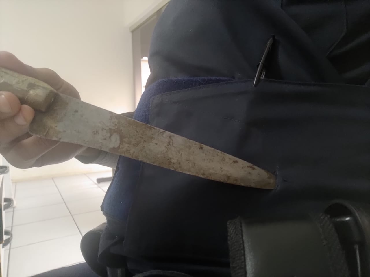 Diante da informação, os GCMs fizeram o patrulhamento e encontraram o delinquente que ao ser abordado, sacou uma faca de grande porte e desferiu contra o GCM Bueno na altura do abdome, a faca chegou a perfurar levemente o colete balístico. Na sequência o meliante foi detido e algemado.