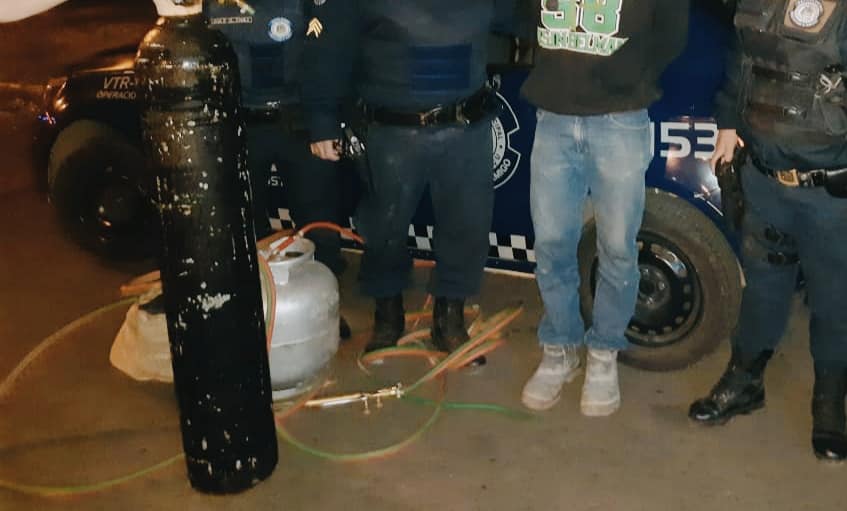 Com apoio de demais viaturas, foi constatado que o trio estava munido de maçarico, botijão de gás e cilindro de gás e já haviam cortado partes da barra de ferro, o veículo apreendido ostentava placas de outro veículo e já estava carregado com seis barras de ferro.