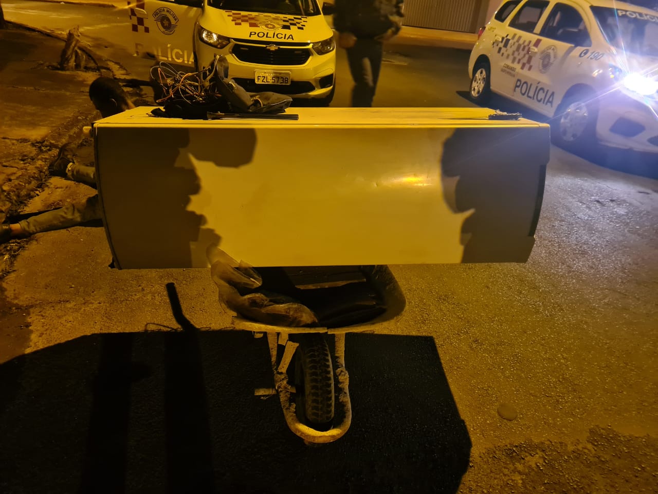 A equipe então realizou a abordagem na Rua Santo André e questionou o suspeito sobre uma carriola, uma geladeira, produtos alimentícios e ferramentas que estava transportando e ele confessou que havia pego do estabelecimento comercial.