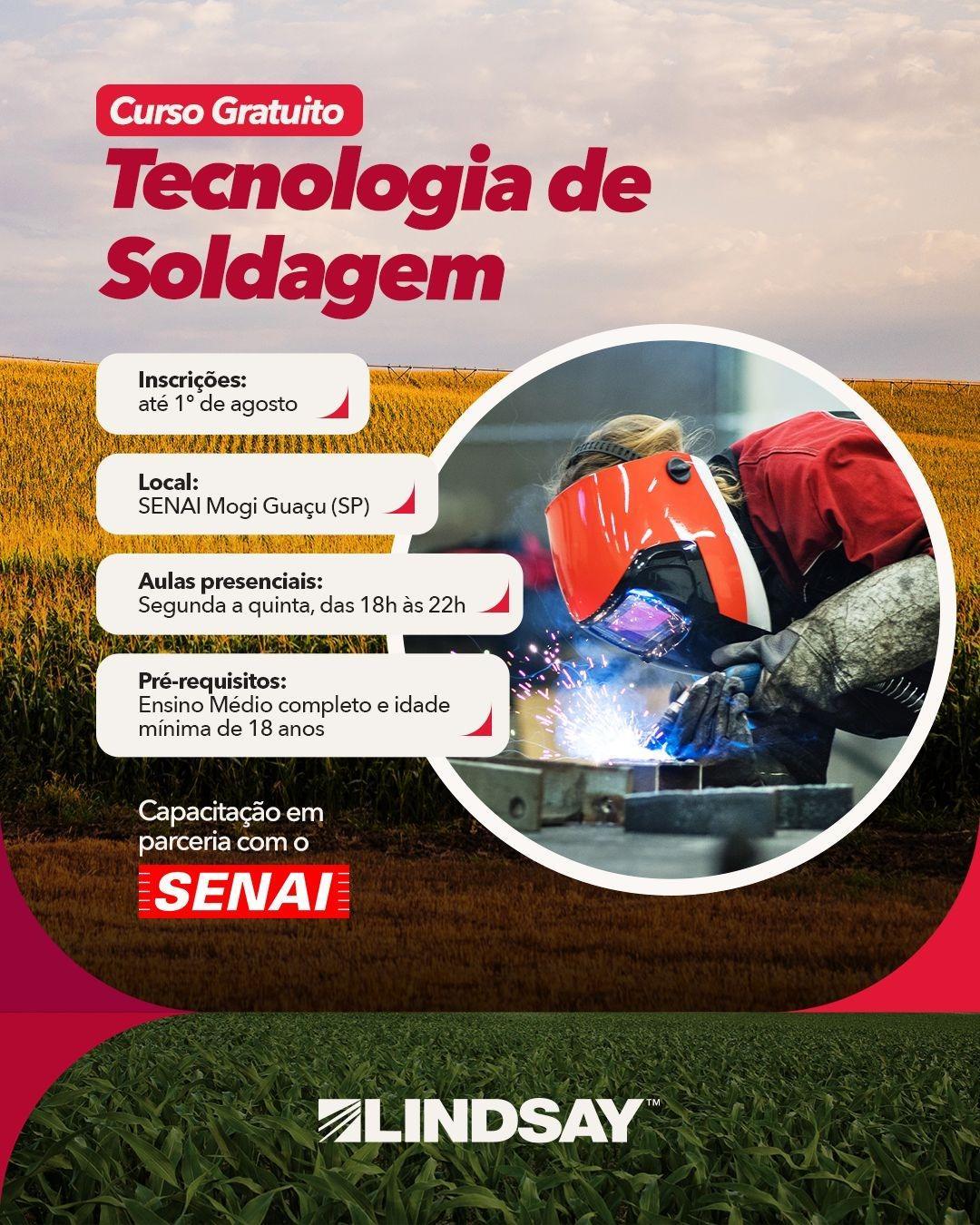A Lindsay, líder mundial em tecnologia para irrigação no agronegócio, promove, em parceria com o SENAI, um curso gratuito de aperfeiçoamento em Tecnologia de Soldagem, destinado a pessoas com ensino médio completo e mais de 18 anos. As inscrições estarão abertas até 1º de agosto e as vagas são limitadas.