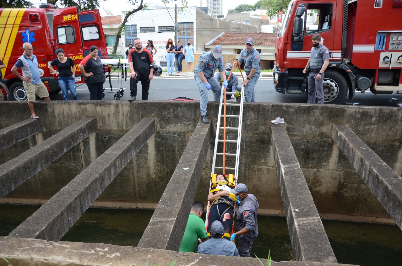 Testemunhas acionaram o Resgate do Corpo de Bombeiros que rapidamente chegaram ao local e com a ajuda de uma escada prestaram os primeiros socorros á mulher e a conduziram para cuidados médicos na Santa Casa.