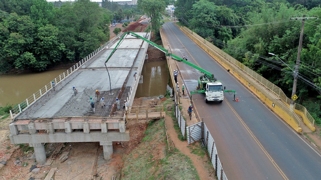 Nesta quarta-feira, 9 de novembro, a empresa Trilha Engenharia concluiu os serviços de concretagem da laje estrutural da nova ponte da Avenida Brasil.