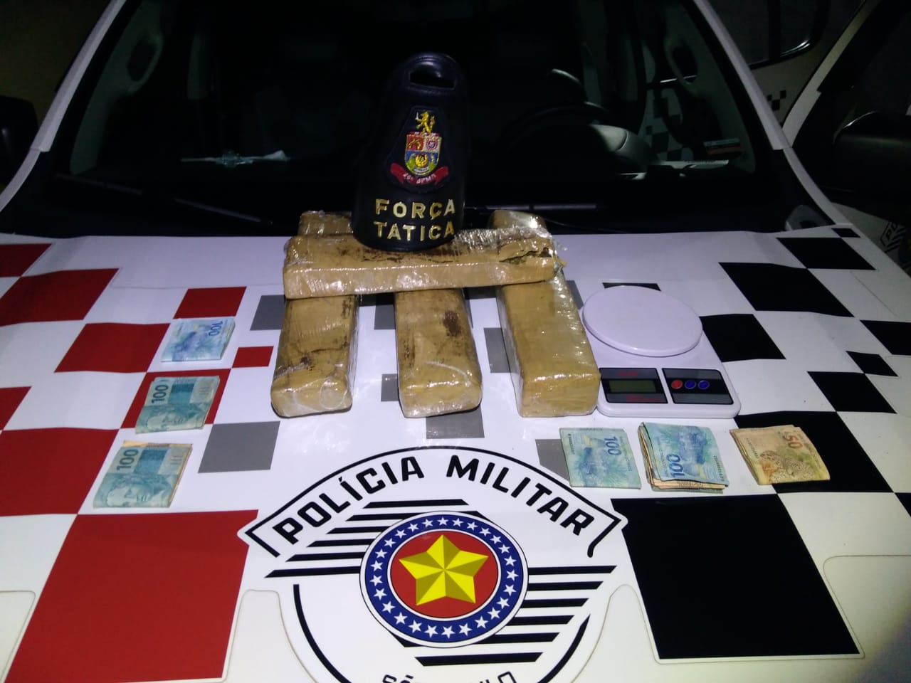 Com apoio de outra viatura de Força Tática, os PMs se deslocaram para a residência dele e encontraram 4 tijolos de maconha com cerca de 5,5 quilos junto com uma balança de precisão e um caderno com anotações do tráfico de drogas e envolvimento com facção criminosa, os PMs ainda encontraram em um armário R$ 6 mil.