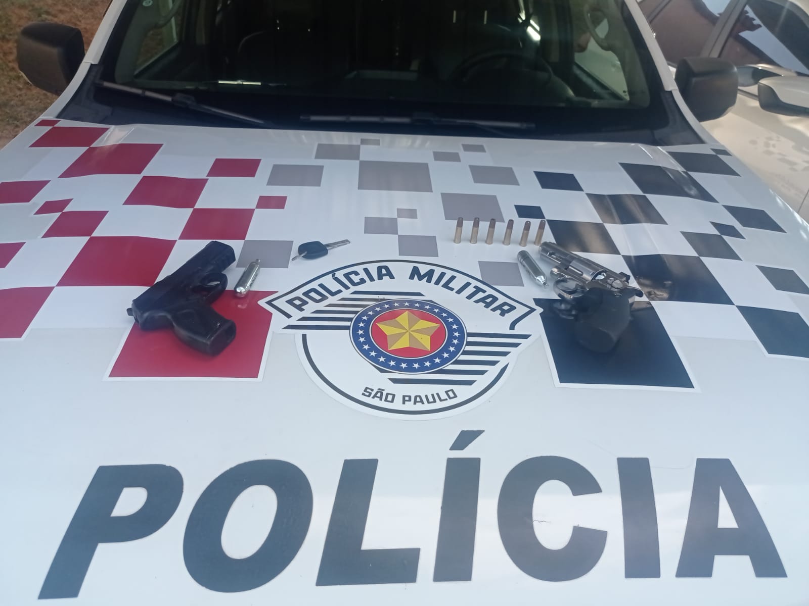 Durante a ação, os policiais localizaram um simulacro de revólver que havia sido descartado pelos suspeitos durante a fuga. Já na residência do indivíduo detido, com autorização de sua mãe, os agentes encontraram mais um simulacro de pistola.