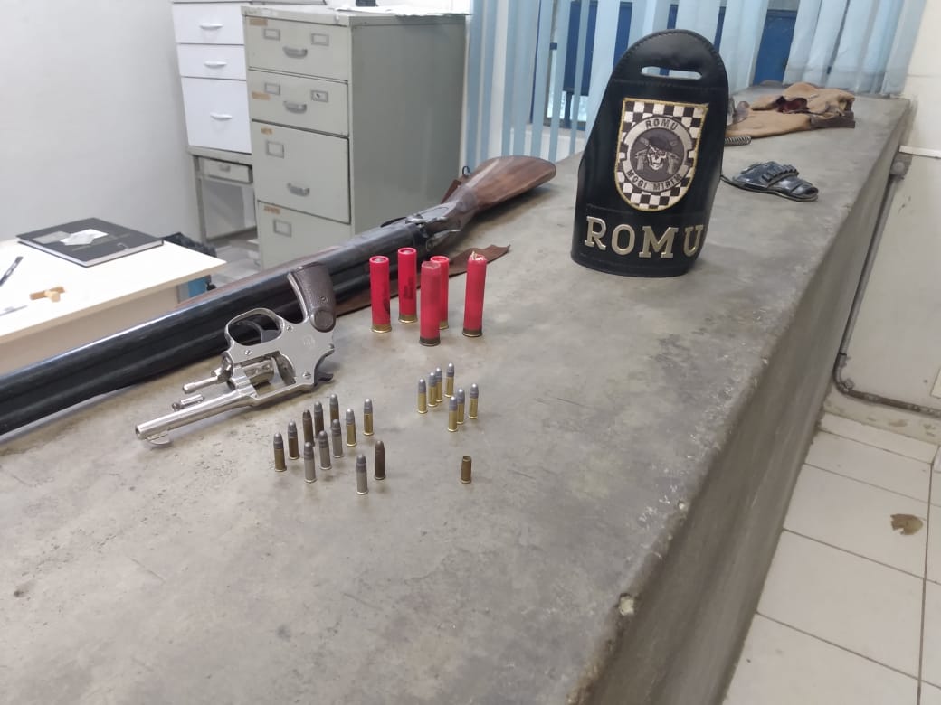 A vítima indicou a residência do agressor e com apoio de outras viaturas foram até a referida casa e encontraram Alexandre, o qual permitiu a entrada em sua residência onde foi localizado atrás do sofá um revólver Rossi cal.22 municiado com 7 munições intactas e mais 12 munições intactas separadas e atrás da geladeira foi localizado uma espingarda Rossi cal.28 com mais 5 cartuchos intactos.