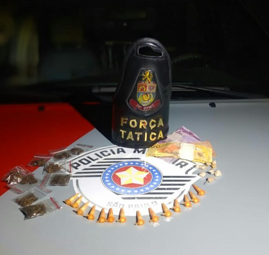 Os PMs flagram o exato momento em que um homem, identificado como sendo J.V.U. entregava drogas para um usuário que estava em um carro. O usuário se evadiu, mas o traficante foi detido e em suas mãos foram localizados 12 pinos de cocaína e mais alguns no chão, o qual ele tentou dispensar. Ainda foi encontrado nos seus bolsos diversas pedras de crack e trouxinhas de maconha, além de certa quantia em dinheiro, este proveniente da venda da droga.